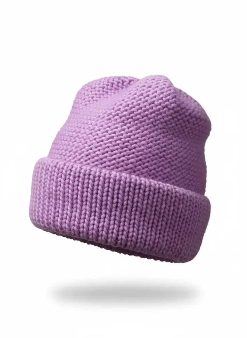 Wrap yourself in cozy style with this vibrant lilac knit beanie. Featuring a chunky texture and a classic wide ribbed cuff, it provides essential warmth and a cheerful pop of color for any chilly day.